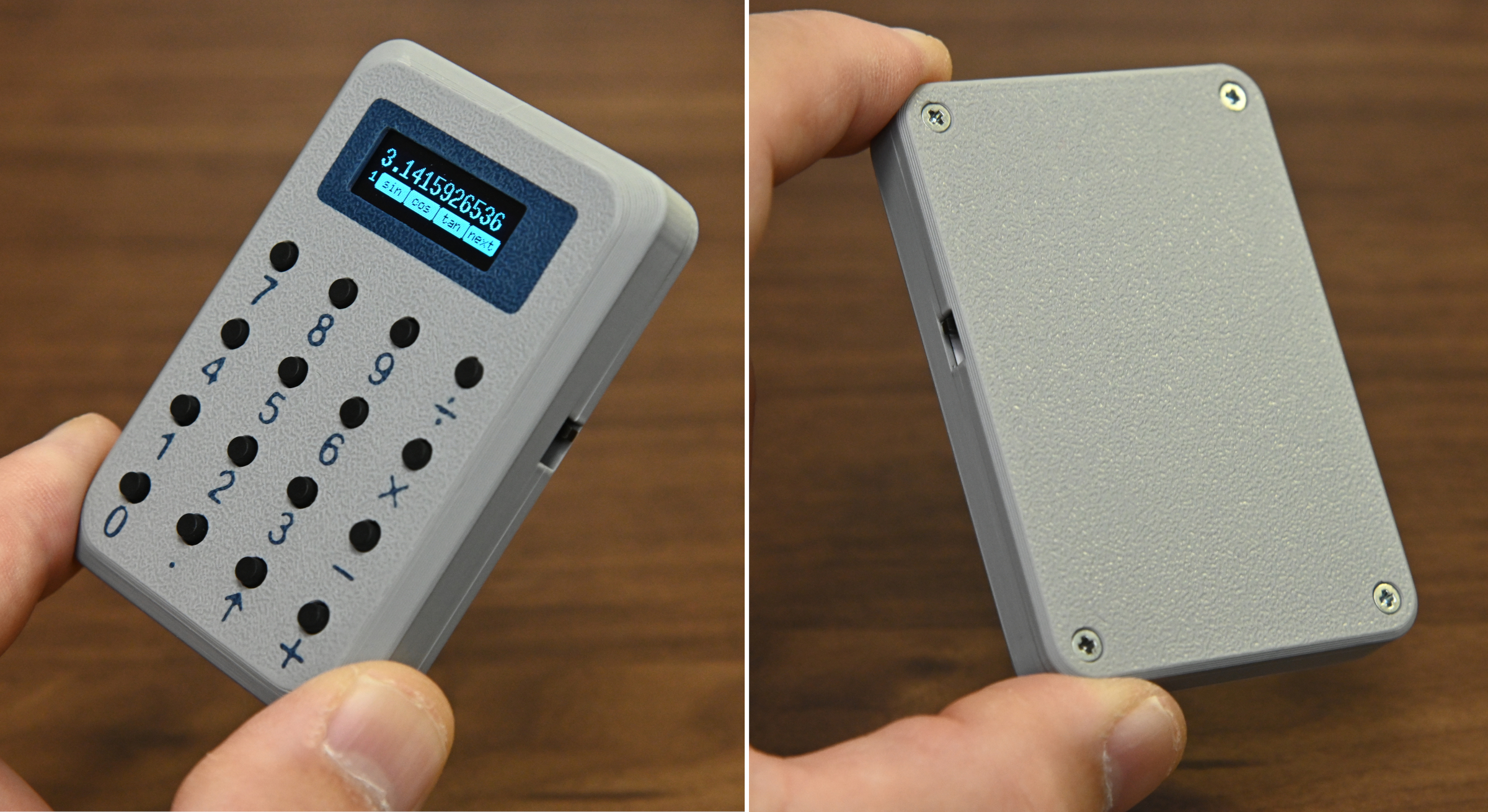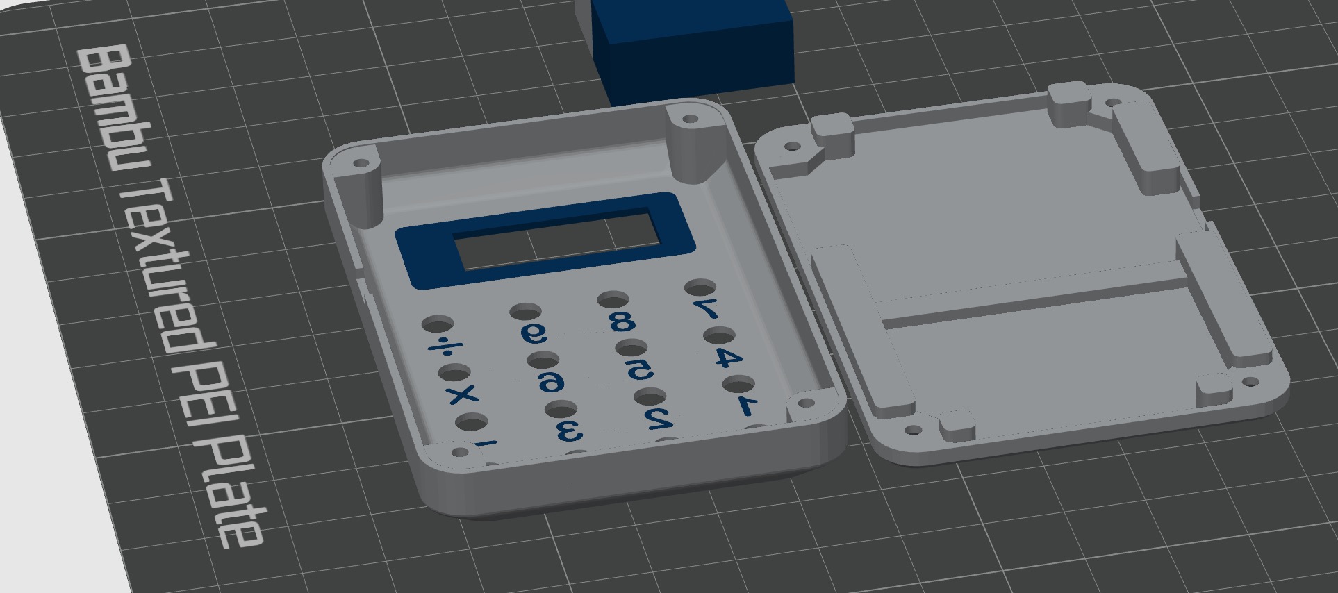 ホビーRPN電卓のオリジナル外装はアクリル板のレーザカットで、中身がよく見えるし、シンプルなガジェット感が好ましいものだと思う。ただやはり側面が空いていることや、基板上の文字が見づらいこともあり、外装を3Dプリンタで制作した。以前も何度かチャレンジしたが、そのときのプリンタは多色プリントに対応していなかったため、文字は穴で表現するしかなく、見やすいとは言えないものであった。それに対し今回は BambuLab P1S のマルチマテリアル機能を活かし、見やすいようにできるだけ大きく文字を入れてみた。文字の大きさは、大きいほどプリントが安定になるというメリット(理由)もある。