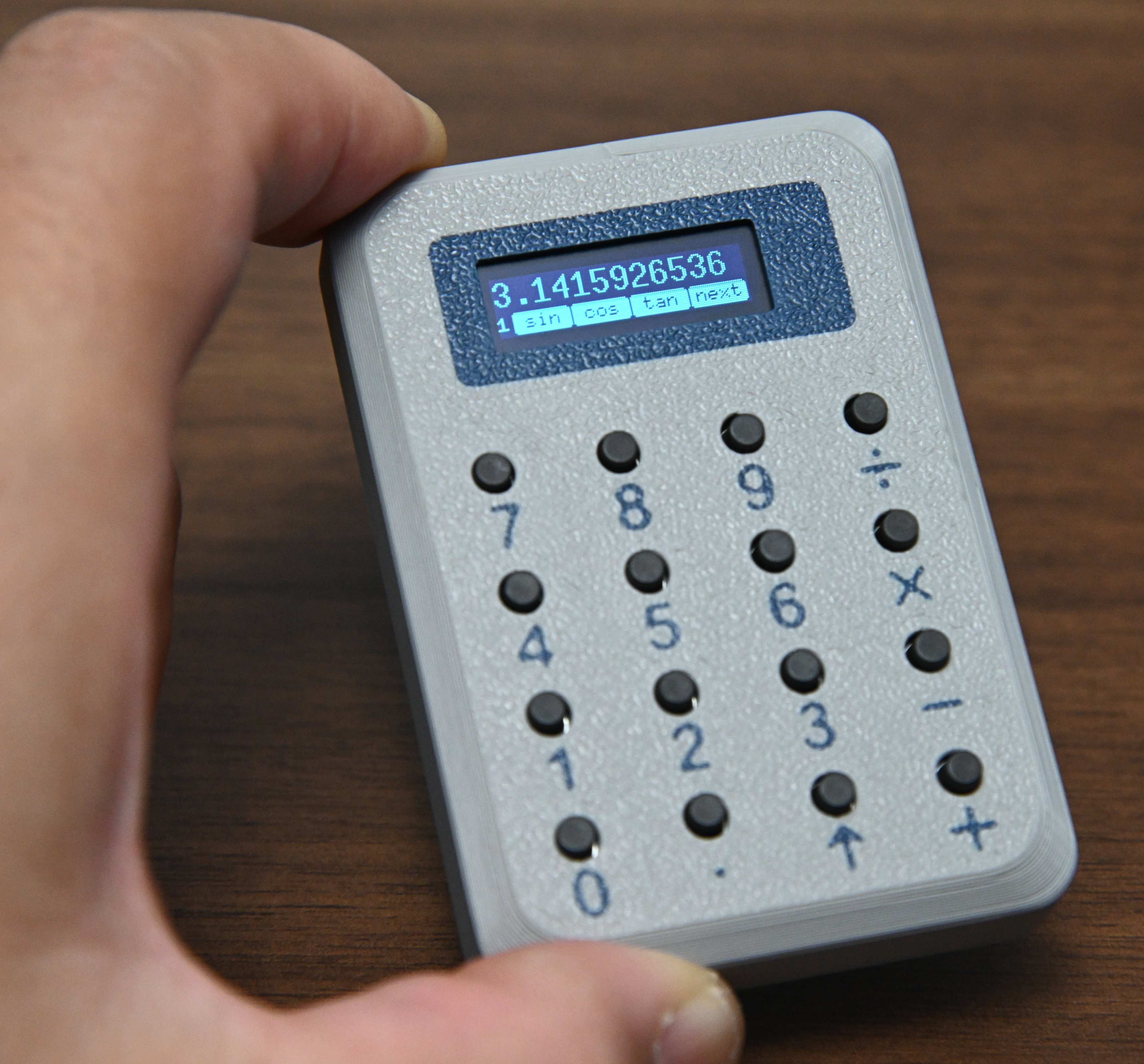 上の写真は、数値を常に分数として取り扱うことで、計算を繰り返しても誤差が全く生じない電卓のコード*1を焼き込んだものである。この電卓もなかなか便利で、加減乗除のキーしかないこの電卓に合っている気もするが、せっかくグラフィック表示できるディスプレイを搭載しているので、関数電卓化にもトライしてみた。