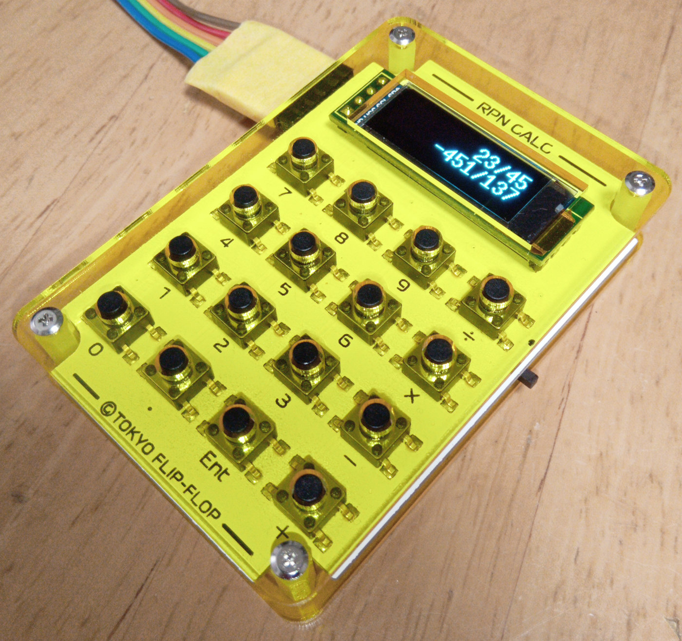 オリジナル外装のホビーRPN電卓に書き込み端子を装着し、分数による「誤差なしRPN電卓」ファームウェアを書き込んだもの